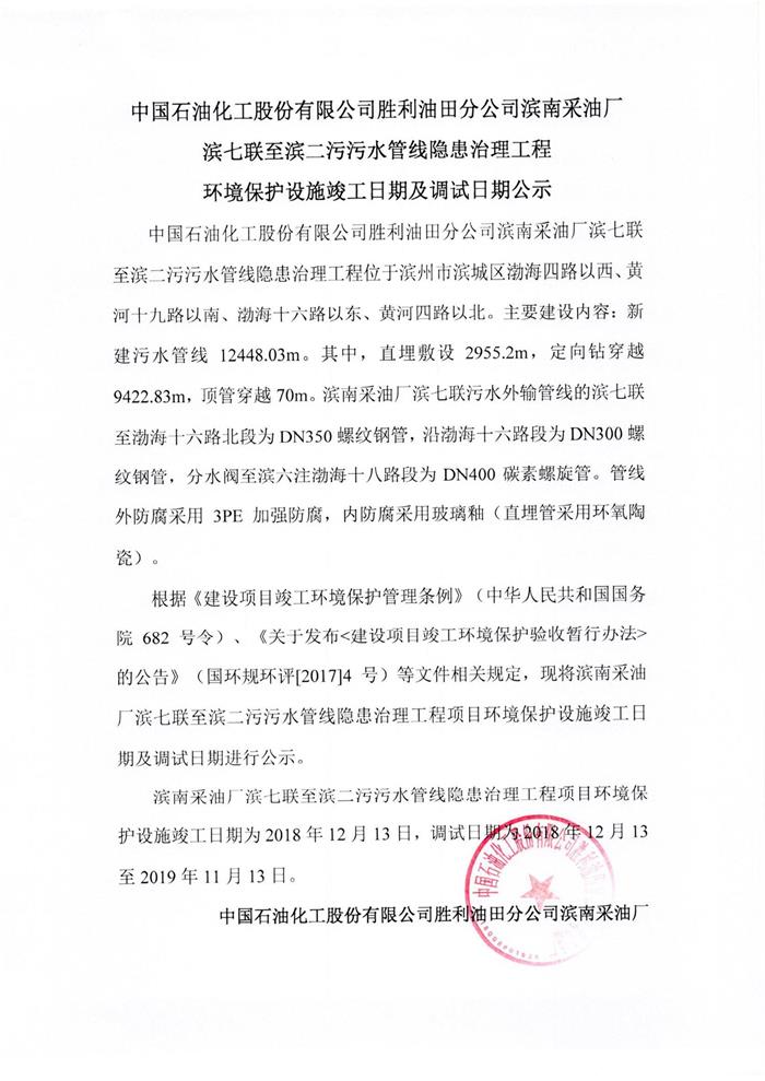 中國石油化工股份有限公司勝利油田分公司濱南采油廠濱七聯(lián)至濱二污污水管線隱患治理工程環(huán)境保護設施竣工日期及調(diào)試日期公示